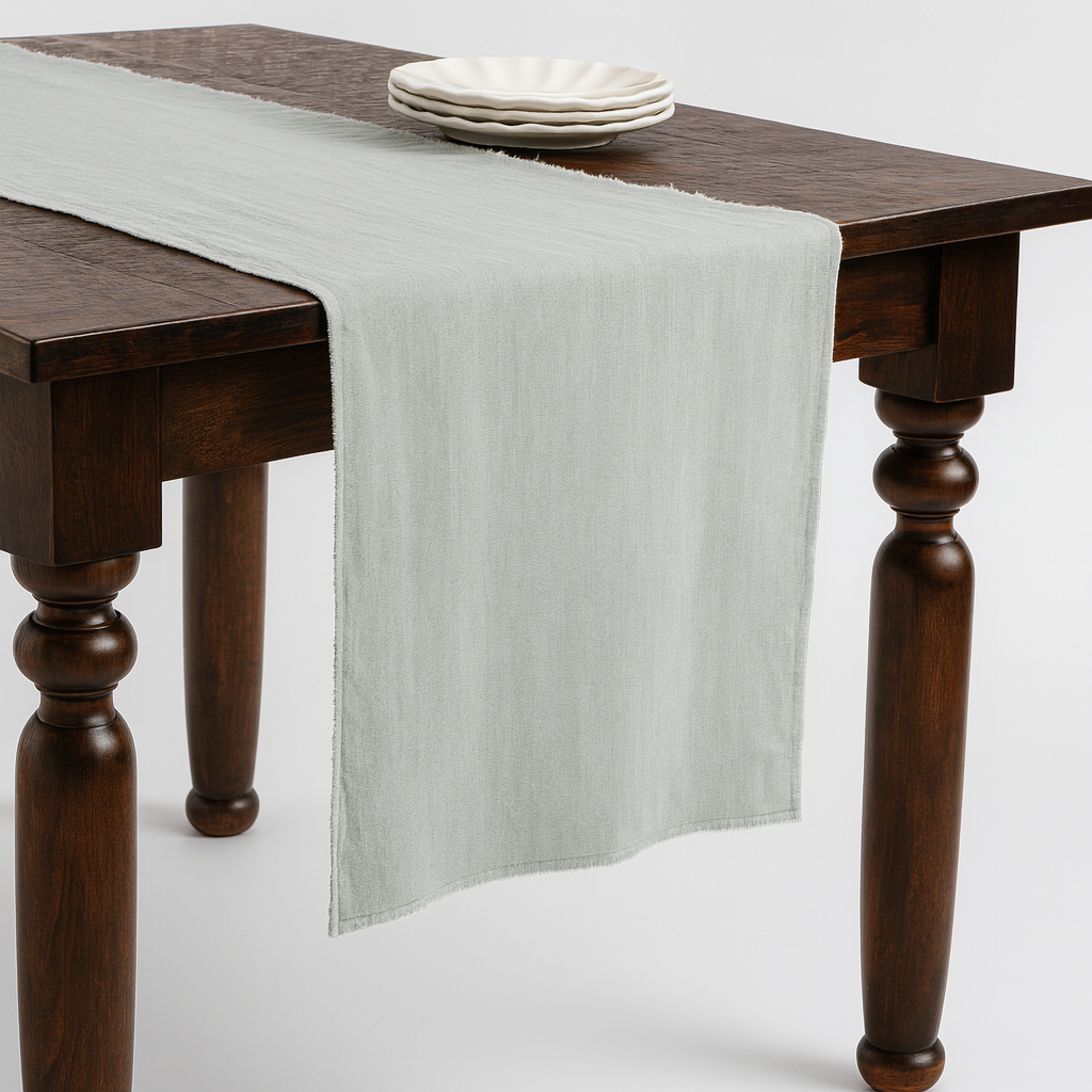 Blue-grey fringed Stone Washed Pure Linen Table Runner