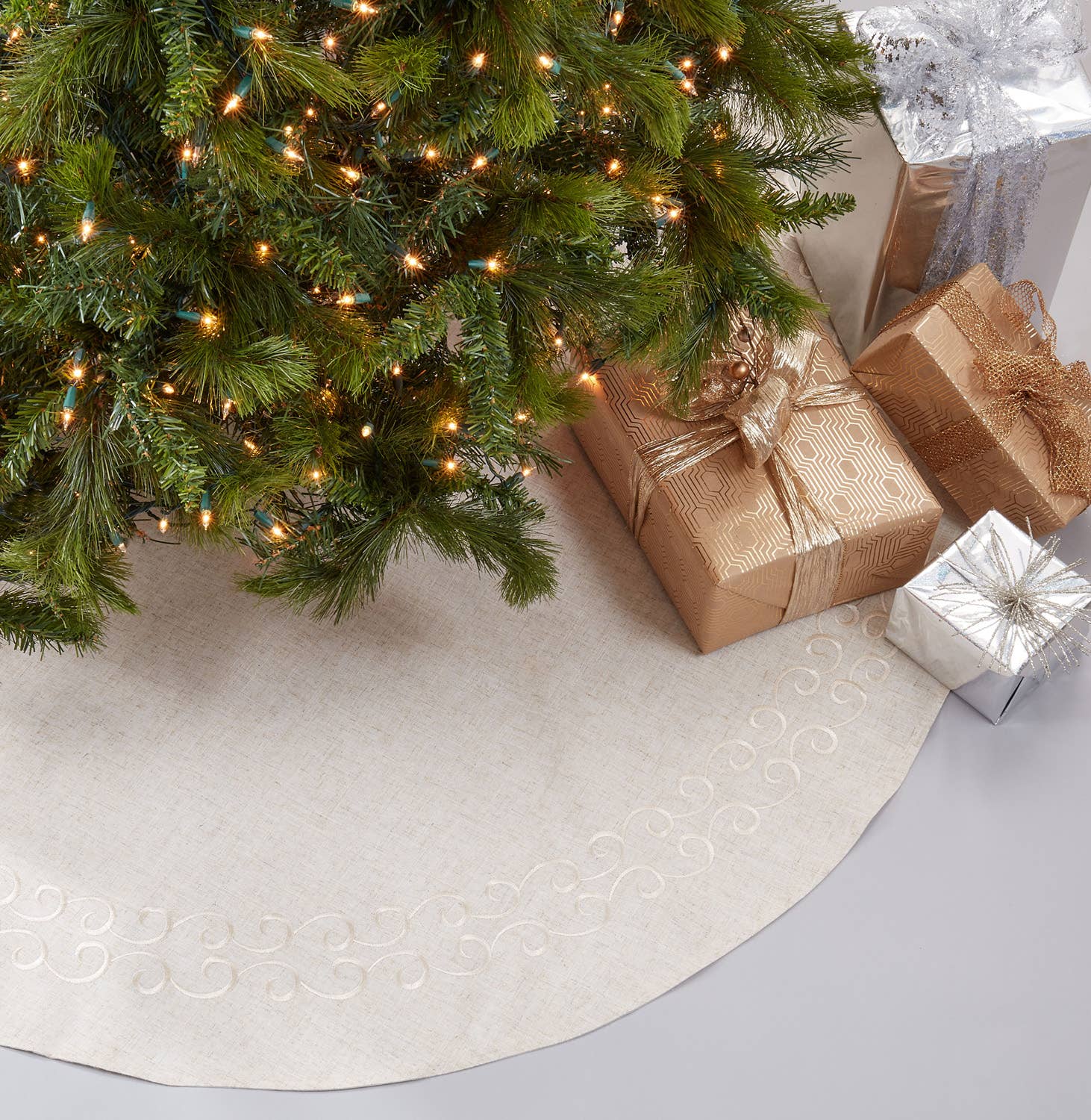 No matter what theme you're choosing for your Christmas Tree this season, the Embroidered Design Tree Skirt adds a lovely finishing touch to your holiday decor. It features a natural look and feel, that's easy to style with. The beautiful embroidery along the round edge brings a stylish, refined note while adding light floor protection from falling needles.