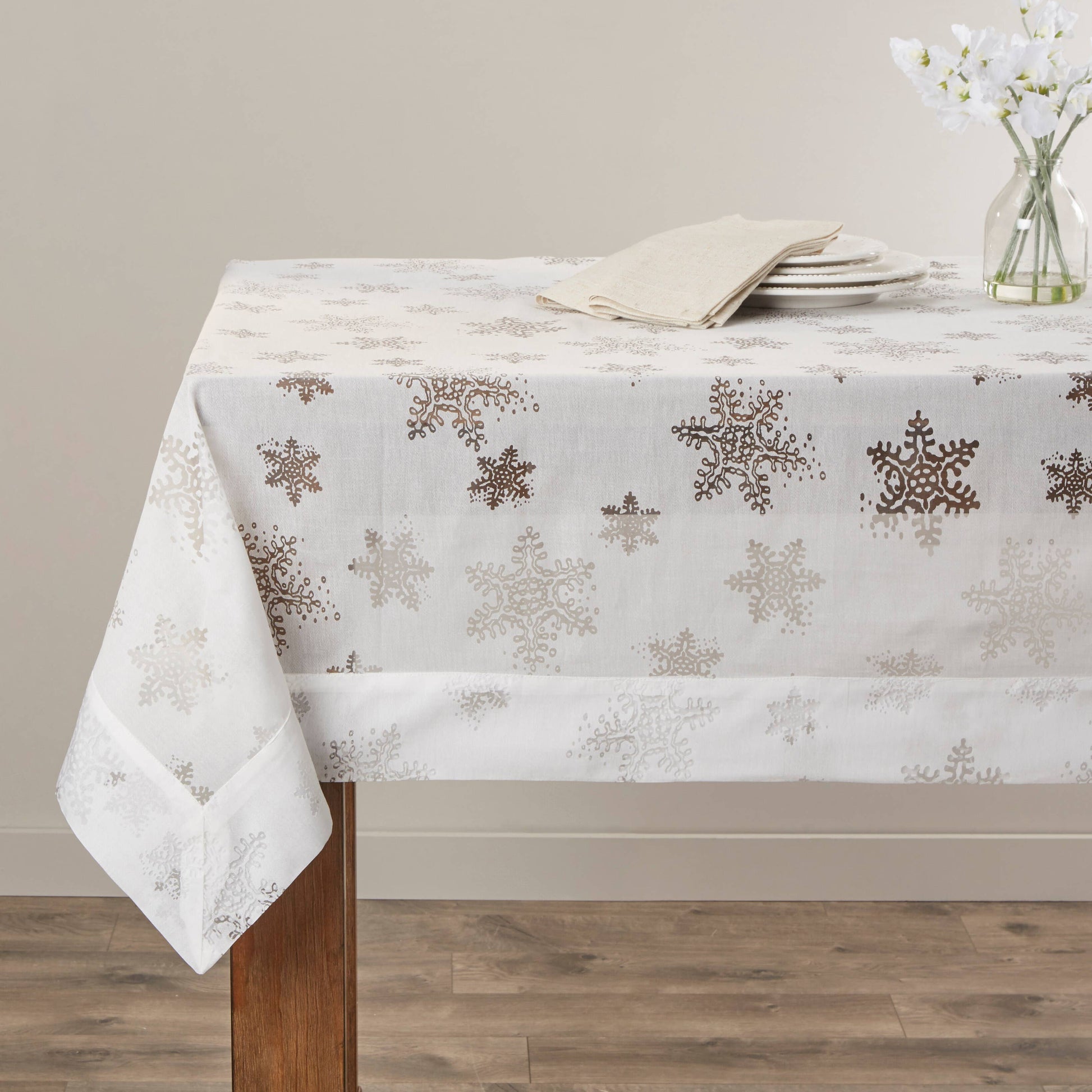 Bring a refined touch to your holiday table decor with this beautiful and festive tablecloth. The lightweight textile is covered with a sheer snowflake burnout design for a soft and timeless look. To create a classic and elegant tablescape, complete the look with the matching napkins, silver accents and clean dinnerware.