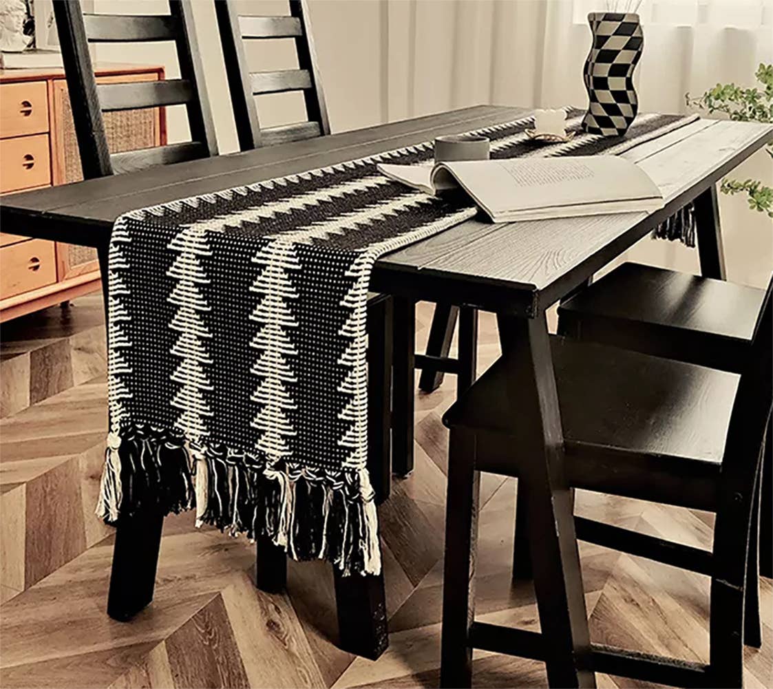 Black Reversible Geometric Cotton Table Runner with Fringe